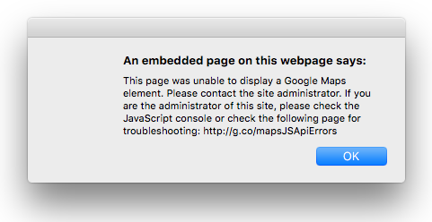 以前のポップアップ型のエラーメッセージは、ウェブページの上に表示されていました。ユーザーは、そのページで地図を操作することがなかったとしても、この JavaScript の警告画面の OK ボタンをクリックしないとウェブページを操作することができませんでした。また、概要的なエラーメッセージが 4 種類用意されているだけでした。改良版では開発者とユーザーは何を見ることができるのか?